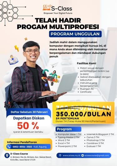 Program Multiprofesi S-Class hadir untuk kamu yang ingin meningkatkan skill digital dengan bimbingan instruktur berpengalaman dan dukungan penuh 💻✨